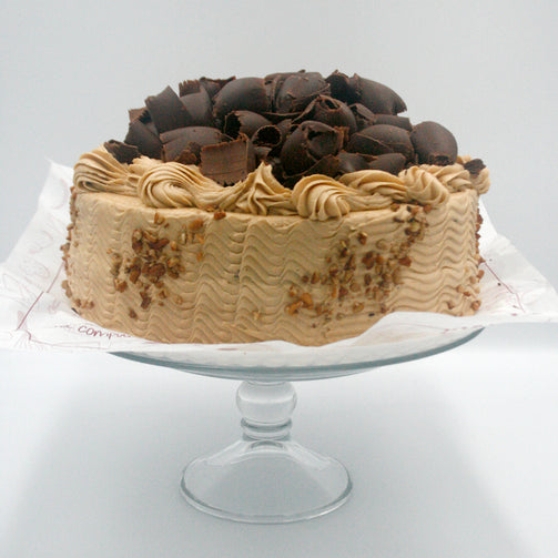 Pan de chocolate relleno de cremaquilla de chocolate con nuez, cubierto de cremaquilla de café decorado con hojarasca de chocolate y nuez. (16 porciones)