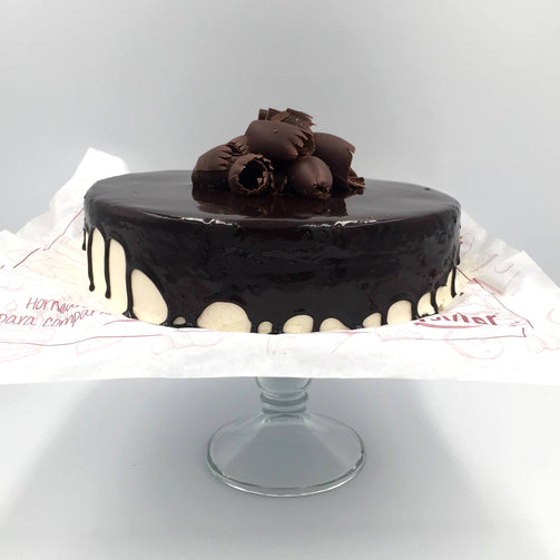 Una capa de pan de chocolate y una capa de pastel de queso relleno de cremaquilla de chocolate y nuez cubierto de chocolate. (16 porciones)