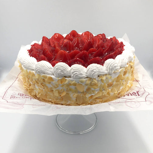 Una capa de pan natural y una capa de pastel de queso relleno de chantilly con cobertura de chantilly con almendra y decorado con exquisitas fresas