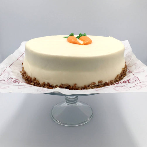 Pan de zanahoria con relleno y cobertura de betún a base de queso crema decorado con nuez. (16 porciones)