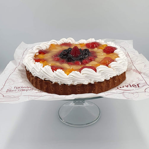 Deliciosa capa de queso sobre una base de galleta con crema pastelera, decorado con frutas de temporada y crema batida. (12-14 porciones)