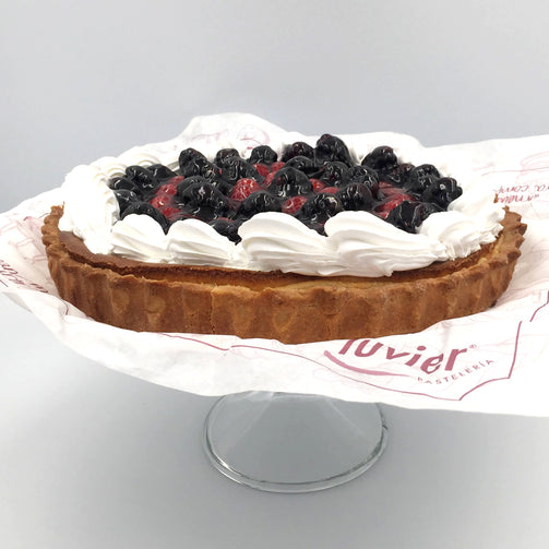 Deliciosa capa de queso sobre una base de galleta con mermelada de zarzamora, decorado con zarzamoras rojas y negras y crema batida. (12-14 porciones)