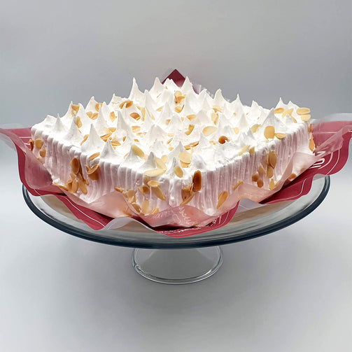 Pan natural relleno de crema pastelera, bañado en tres leches y cubierto de merengue con almendra
